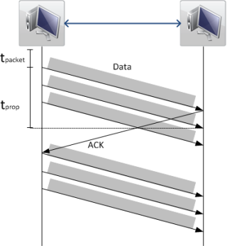 The propagation time tprop for a TCP packet can be determined by measuring the round-trip-time (RTT) of a packet. Here the round-trip-time is twice the propagation time for synchronous links. This can e.g. be done via the well known tool ping. The TCP window size is determined by the operating system. During a connection the receiver can also adapt the TCP Window Size - in both directions - if the situation changes due to packet loss or buffer fill levels.