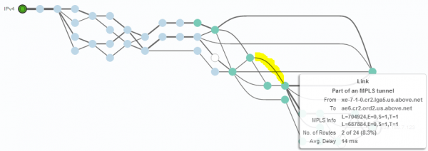 Looking at one of the problematic links (highlighted in yellow) via the IPv6 path, we can see a high delay and loss rate (See Figure 16). We also see that this link is part of an MPLS tunnel.