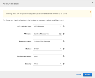 We need to expose the AWS Lambda function via a REST API endpoint, so that Flowroute can invoke the function. Flowroute will send a POST message to the endpoint. Therefore we will solely allow POST messages to our AWS Lambda function.