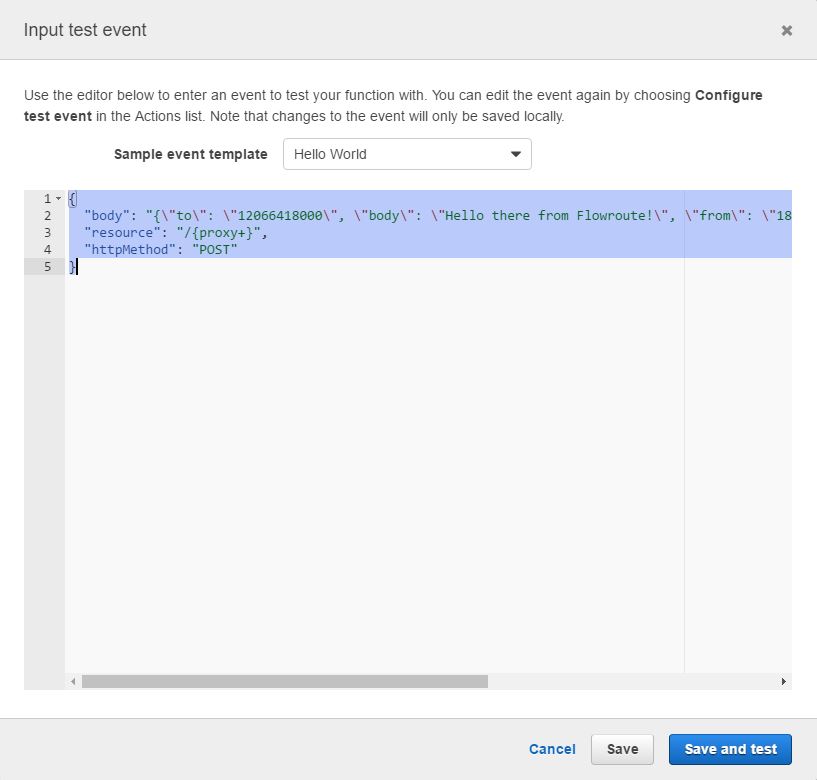 This test event data is derived from the Flowroute Messaging API documentation and is an example for what Lambda will receive from AWS API Gateway.