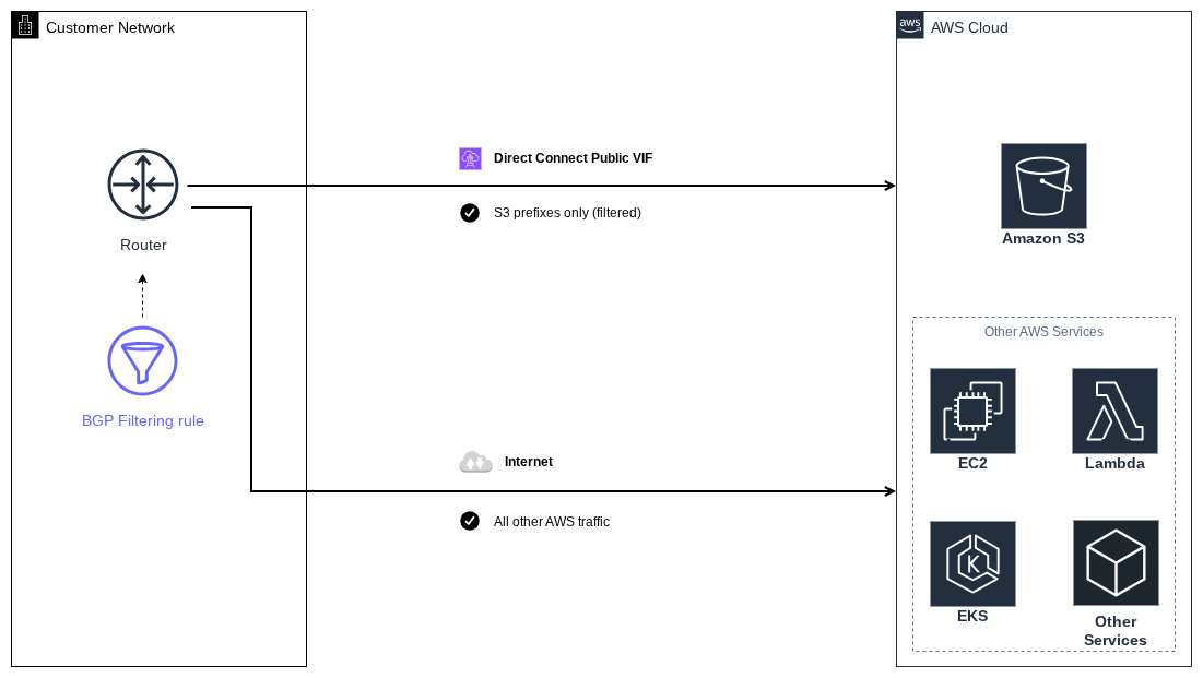 When using AWS Direct Connect with a Public Virtual Interface (VIF) to access S3, customers often face a challenge: by default, the Public VIF receives all AWS public IP prefixes via BGP, not just those for S3. This means traffic to all AWS services - including EC2, Lambda, and others - will route over the expensive Direct Connect connection instead of the internet, significantly increasing data transfer costs.